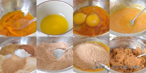 混合均勻 (圖六),倒入南瓜泥蛋液中 (圖七),攪拌混合 (圖八)。