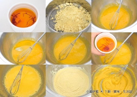 加入番紅花水 (圖六),拌勻 (圖七)。加入麵粉 (圖八),攪拌均勻成蛋黃麵糊 (圖九) 。