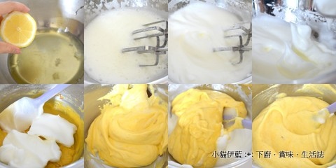 分次混合蛋黃麵糊和蛋白霜,可以逐漸拉近二者的密度,更易混合均勻而減少消泡情況~