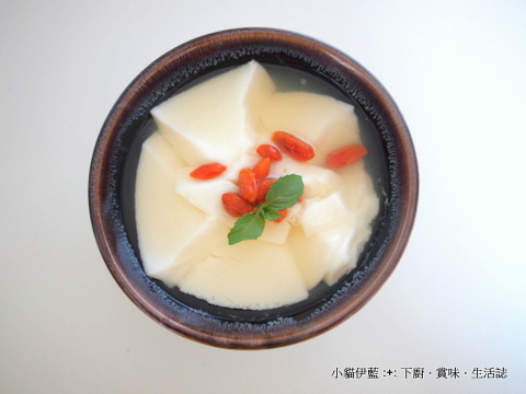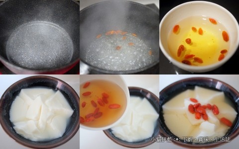 完全放涼成杞子糖水 (圖三)。杏仁豆腐用大匙舀出來,放入碗中 (圖四)。
