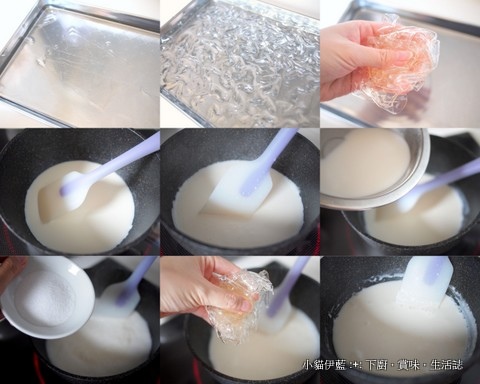 煮好的杏仁奶倒入平底淺盤中,放涼,移入冰箱冷藏至完全凝固 (圖一)。