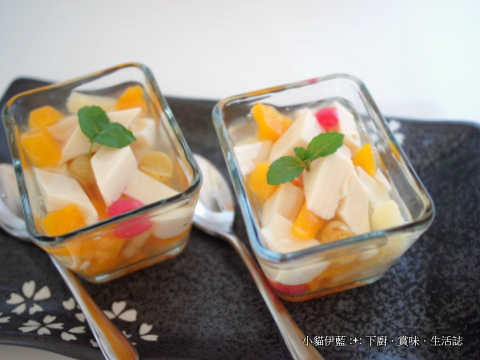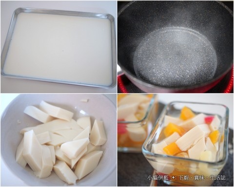 杏仁豆腐切成菱形 (圖三),放入小碗中,倒入完全冷卻的糖水,加入雜果 (圖四)。