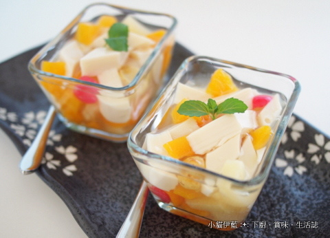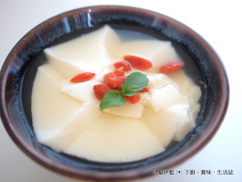 以甜杏仁(南杏)磨漿,以澱粉凝結,切成小塊,扮作豆腐狀,白晢小巧可愛~~~~