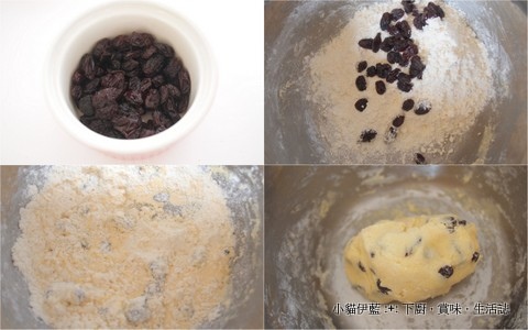 把葡萄乾加入奶油麵粉中 (圖二),混合均勻 (圖三)。