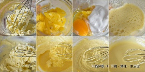 奶油乳酪加入赤藻糖醇,攪拌均勻 (圖五),逐些加入鳳梨蛋液 (圖六),