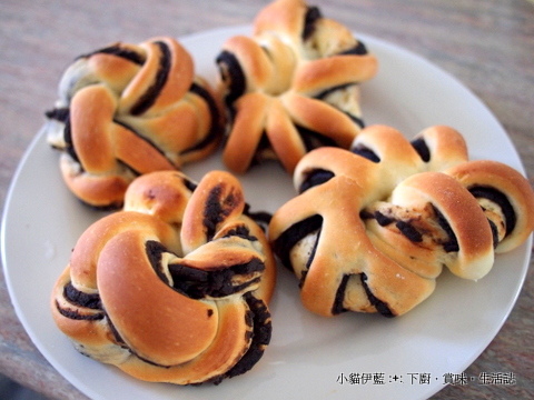 三個多小時之後,一盤四個大大的黑芝麻花紋麵包,熱騰騰香噴噴的出爐了。