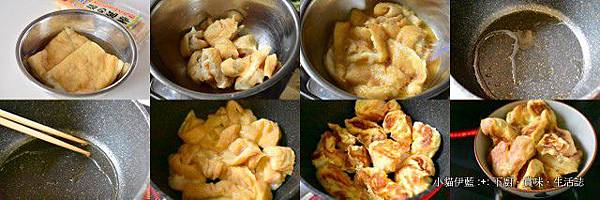 麵麩泡水軟化 (圖一),擠乾水份後切成小段 (圖二)。雞蛋打散,把麵麩泡入 (圖三)。炒鍋放油加熱 (圖四)。