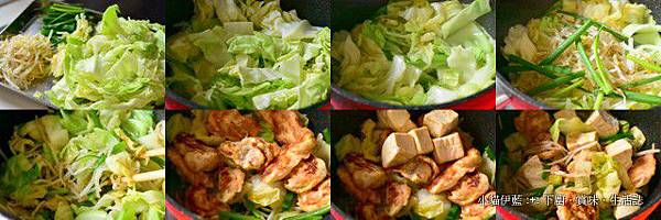 原鍋再添點油,油熱後放入高麗菜 (圖二),中大火翻炒至變軟 (圖三),加入青蔥與芽菜 (圖四),炒勻 (圖五)。