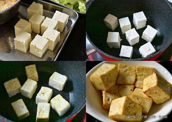 豆腐切丁 (圖一)。原鍋加點油,油熱後放入豆腐丁 (圖二),中小火煎豆腐至各面都上色 (圖三),盛起 (圖四)。