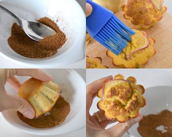拿著蛋糕底部,以蛋糕表面沾取肉桂糖粉 (圖三、圖四)。待涼定形。