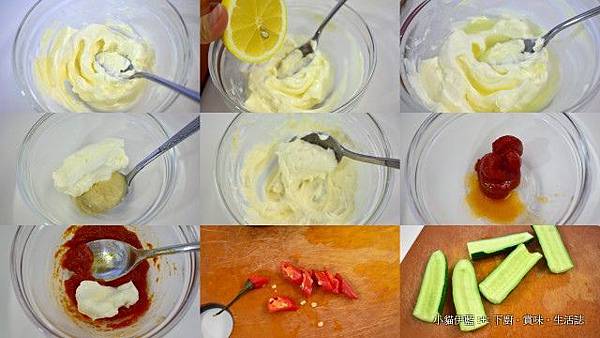 剩下的原味乳酪餡分成4小團,填入小黃瓜船中 (圖五),淋上 Tabasco 辣醬 (圖六),鋪上辣椒圈 (圖七)。