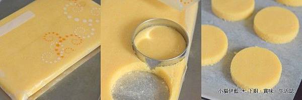 剪開袋子,以餅乾模型壓出小麵片 (圖二),排好在鋪墊烘焙紙的烤盤上 (圖三)。