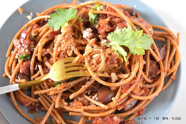 義大利直麵......100克 <---我用全麥麵,所以成品比較深色~ 大家可以用一般的直麵比較漂亮~