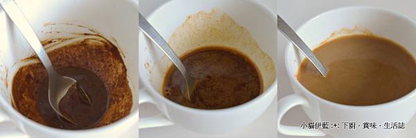 逐些加入熱牛奶,一邊持續攪拌均勻 (圖二)。最後加入全部牛奶、鮮奶油/濃椰漿、蜂蜜,拌勻 (圖三)。
