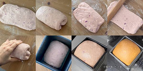 從短邊捲起,成短卷狀 (圖五),收口捏緊並朝下放入吐司模內 (圖六)。