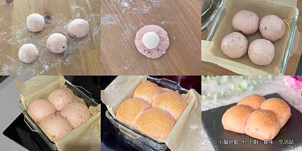 剩下的麵團分切成4等份,每份滾圓 (圖一)。小麵團壓扁,放入10克搓成小球狀的奶油乳酪 (圖二)。