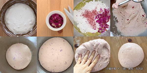 乾燥玫瑰花取花瓣部份剪碎 (圖二)。高筋麵粉、紅麴粉、速發酵母、糖、鹽、玫瑰花放入攪拌缸 (圖三)。
