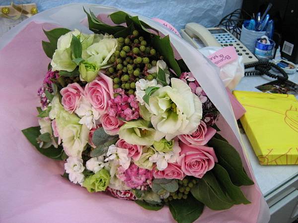當我見完個案,步回辦公室,同事們相當起哄地催我去收花。