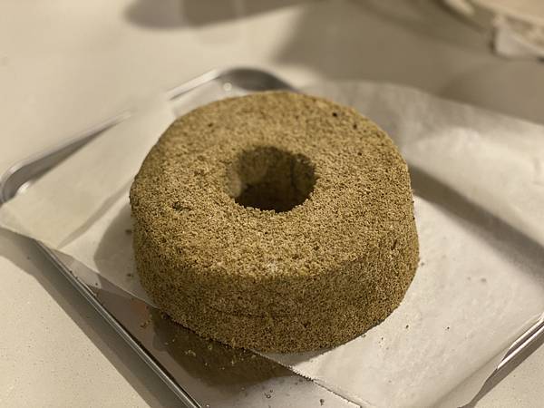 出爐後隨即倒放,至蛋糕完全冷卻,以小刀繞著模邊、中柱、底板刮過,脫模。