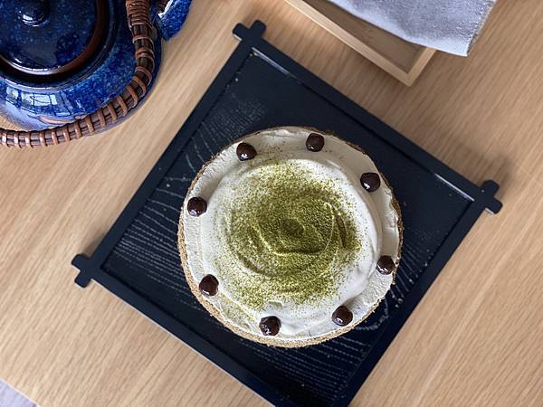 在蛋糕表面舀上起司奶蓋。用小篩子把烏龍茶粉灑在蛋糕奶蓋表面,可以加入額外的珍珠做裝飾。