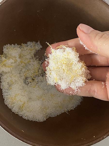 檸檬刨下黃色部份的外皮皮屑,加入砂糖,用手抓捏,令檸檬皮的精油融入砂糖顆粒中。