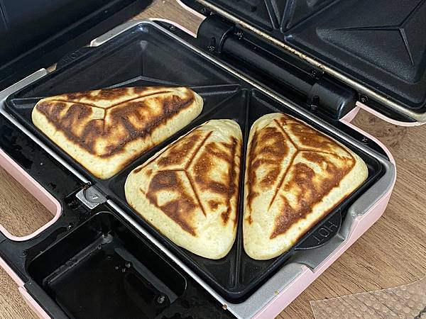 鬆餅機安裝三角形熱壓三明治烤盤,預熱。預熱完成後,在模型中倒入麵糊至滿模,蓋上機蓋。