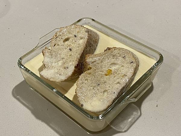 把蛋奶液倒入平底淺盤浸泡麵包,蓋上保鮮紙,送入冰箱冷藏一夜,讓麵包吸滿蛋奶液。