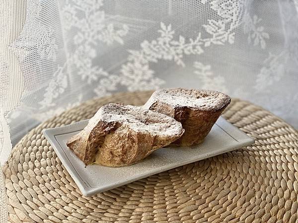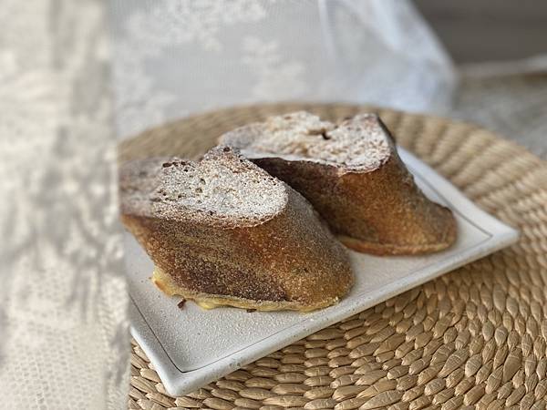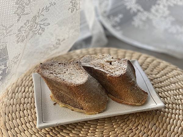 翌日將麵包夾起,送入氣炸鍋,以180度C炸15分鐘,完成後燜5分鐘。取出,灑上足量的糖粉。