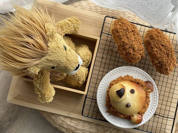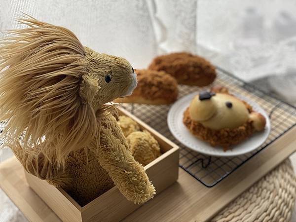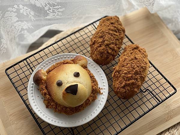 同樣在二酵之後刷上蛋液烘烤 (同溫同時),冷卻之後以美乃滋塗抹頭部外圍,沾上肉鬆做鬃毛。