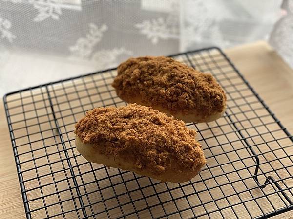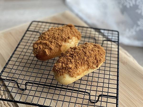 出爐,置網架上放涼。完全冷卻之後,抹上一層美乃滋,沾上足量的肉鬆。