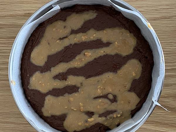 無糖花生醬、蜂蜜、無糖豆奶拌勻,淋在布朗尼麵糊表面。在放上一些切細的香蕉。